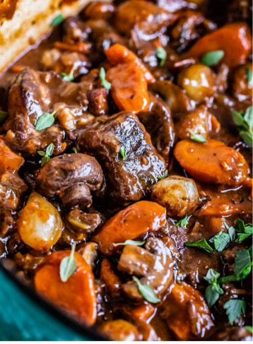 grass-fed beef seasoned and seared, braised in a tomato red wine beef broth with root vegetables, baby onions, fresh hers and roasted garlic polenta.