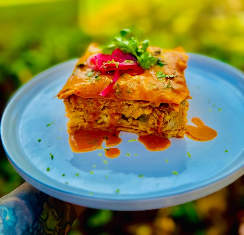 organic chicken rubbed in smoky spices, slow cooked and layered with cilantro lime rice, fire roasted peppers, charred tomato, black beans, organic corn tortillas, house enchilada sauce and dairy-free ‘nacho’ sauce.