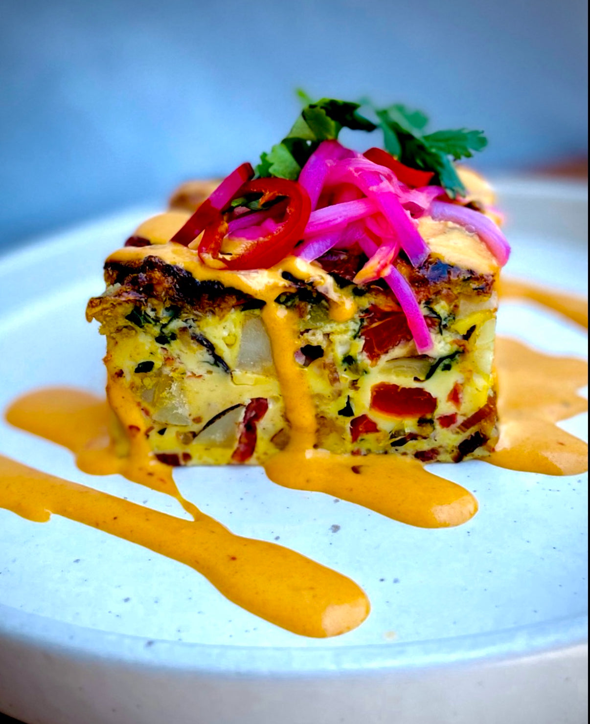 farm fresh eggs and seasoned ground beef with caramelized onion, fire roasted chilies, crispy potatoes, and spinach topped with bbq aioli.