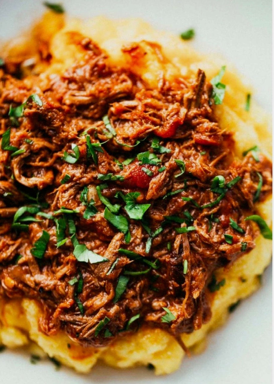 grass-fed beef seasoned and slow cooked in a light roasted garlic tomato sauce, mirepoix, baby spinach, and herbs, over organic ghee infused polenta.