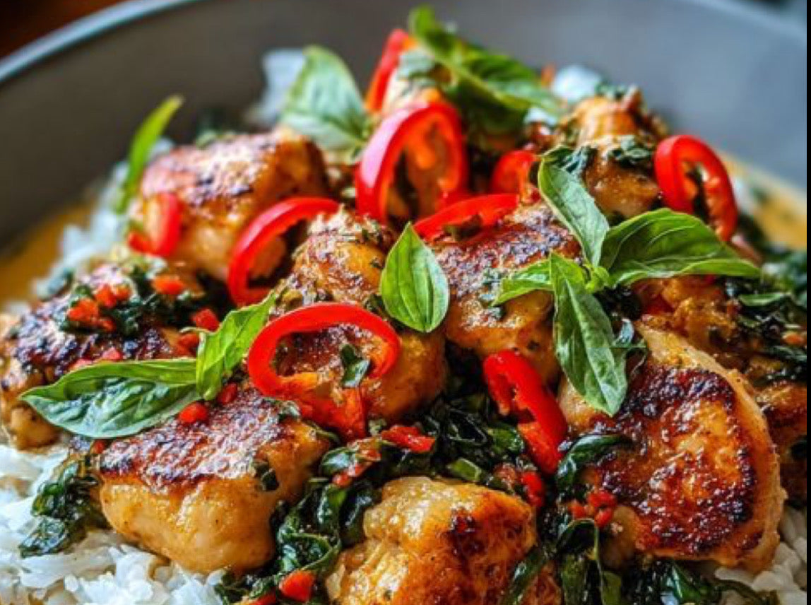 coconut basil chicken with charred summer squash and steamed jasmine rice